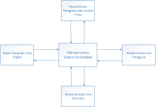 Selanjutnya, kami membagi kedua modul besar menjadi subsistem-subsistem yang dapat menjalankan tugas secara lebih spesifik. keempat subsistem tersebut adalah subsistem motor penggerak dan kontrol posisi, subsistem akuisisi citra otomatis, subsistem pengolahan citra digital, dan subsistem antarmuka pengguna. Memang benar, beberapa subsistem memiliki komponen yang dapat overlapping satu dengan yang lainnya. Contohnya, subsistem pengolahan citra digital akan menggunakan sistem mikroprossor yang sama dengan yang digunakan oleh subsistem antarmuka pengguna.