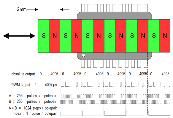 Pada prinsipnya, terdapat sebuah magnet linear multipole yang memiliki lebar kutub magnet sekitar 1 mm. Dengan bergeraknya IC sensor ini dalam jarak 3 mm dari magnet, IC akan mendeteksi perubahan medan magnet. Data yang dikeluarkan oleh sensor ini berupa PWM maupun counter sehingga interfacing nya cukup mudah.